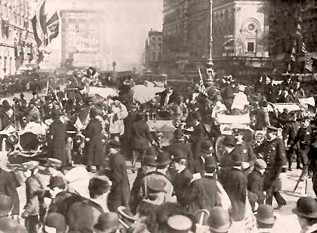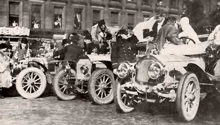 ![]() The Zust, the Protos and the De Dion lined upon Broadway, |