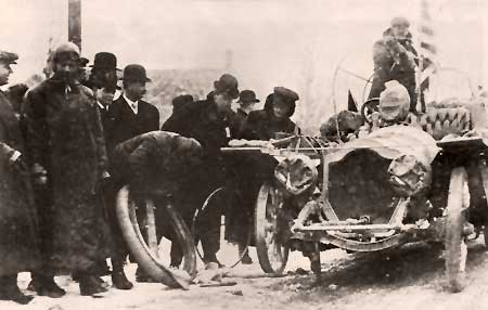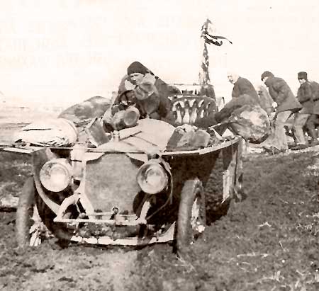 At San Francisco, Schuster was made captain-driver of the Thomas. After repairs it was shipped by steamer to Seattle, where George McAdam, a New York Times man joined, then in a second steamer to Valdez, Alaska. There snowdrifts as high as houses prevented it being driven off the dock. It was shipped back to Seattle. There Schuster learned the race was to be resumed in Vladivostok; that the Zust and De Dion which followed him into San Francisco, were enroute there by way of Japan; that the Protos, which had been shipped by rail to Seattle from its last breakdown near Pocatello, Idaho, was being sent direct to Vladivostok. Schuster chose to go by way of Japan. At this point, the Race Committee gave the Thomas a 15-day advantage for going to Alaska and penalized the Protos 15 days for not driving to San Francisco. This proved important. As all four cars reached Vladivostok, three of them after 350 tortuous miles across Japan, the Marquise de Dion, maker of the De Dion car withdrew it. In a frantic effort to stay in the contest, St. Chaffray attempted to buy all the gasoline available in the area and trade it for a seat on the Thomas or the Zust. Both crews refused him and found other gasoline. Koeppen and two experts from the Protos factory, Robert Fuchs and Casper Neuberger, overhauled the German car and stripped it of every ounce of excess weight. While the Zust was delayed further, the Protos drove west from Vladivostok at 8 a.m. May 22, a rainy day. The Thomas followed two hours later. The cars traveled, MacAdam wrote, “out into a dismal flat, rain- drenched country, over or rather through a road that was a streak of mud far as the eye could reach.” Both had chains on the rear wheels. |