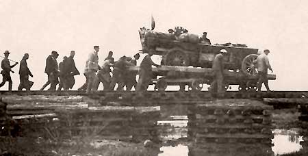 In Manchuria, using a railroad track for a road, the Thomas was halted temporarily by a bridge which had the cross ties too far apart for driving. |