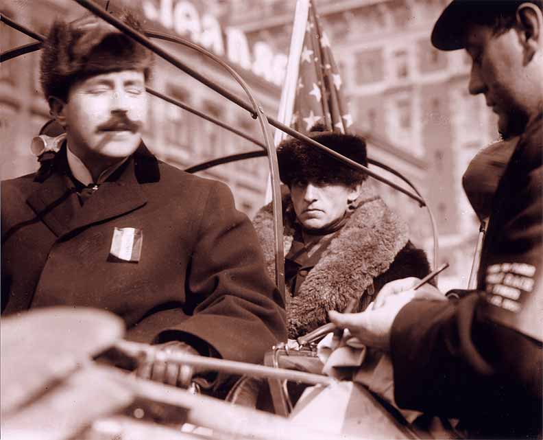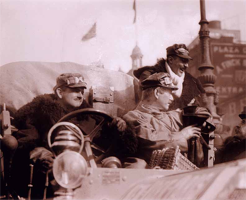 Besides 20 mostly fur-garbed men, the cars carried American flags, hampers of food and drink, sleep gear, spare parts, extra gasoline tanks, searchlights, lanterns, chains, ropes, planks, picks and shovels, some even firearms. The weather was clear and around freezing when a shot from a gold-plated pistol started the race and the Sizaire-Naudin with Auguste Pons at the wheel, led the cars out of Times Square. But shovels were soon needed. Albany was the first day’s goal via what is now Highway 9 but beginning at Yonkers thawing snow “transformed a naturally unsatisfactory highway into a veritable quagmire.” Despite chains, car after car became stuck. “I will win,” said a Frenchman, “I shovel very hard.” The Zust led at first, then the Thomas. These and the De Dion made the 116 miles to Hudson through snow drifts and stopped for the night. The Protos was at Poughkeepsie. Mishaps stopped the Motobloc at Peekskill. It never caught up and eventually quit the contest. Pons and the Sizaire-Naudin were out of the race two hours after the start. The rear axle of the little car collapsed climbing Spitlock Hill and replacement parts didn’t work. But Pons is remembered. His daughter, Lily, became one of the greatest opera singers. The other four cars, all of 30 to 60 horsepower, battled ahead. Driving the Thomas was Montague Roberts, 25, a race driver and demonstrator for the Thomas New York Dealer. With him as “mechanician” was George Schuster, 35, a stubborn German- speaking test driver from the Thomas factory and T. Walter Williams, a New York Times reporter. G. Bourcier St. Chaffray, an aristocratic Frenchman who wore white, was captain of the De Dion. He also was “Commissionaire General” for Le Matin. Besides a French mechanic, St. Chaffray had with him Capt. Hans Hendrik Hansen, a Norwegian explorer who couldn’t drive but knew the Arctic. Lt. Hans Koeppen, 31, a determined six-foot officer on leave from the German General Staff, was in charge of the Protos and correspondent for a Berlin newspaper. He had several drivers in the course of the race. Giulio Sirtori drove the Zust with Henri Haaga, mechanic, and Antonio Scarfoglio, a young newspaper correspondent. |