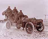 The Zust led for a time but the Thomas was first into Buffalo. There an additional mechanic, George Miller, was assigned to the car. Factory men worked all night substituting a straight axle for the front drop-axle that scraped snow. Blocks were put on top of the axles for more road clearance. The De Dion was overhauled similarly by the Pierce-Arrow plant. It was first to Erie, Pa., but the Thomas was ahead into Cleveland and Toledo. The racers ran into a blizzard. Farmers made money pulling them out of snowdrifts with teams of horses. One day in Indiana the Thomas floundered only eight miles. With roads impassable, the Americans drove into Chicago over Lake Shore Railroad tracks on Feb 25th. The Thomas increased its lead in the mud of Iowa and it was at Carroll, Iowa, that the luckless Motobloc quit the race. Schools sometimes were dismissed to allow children to see the cars. A newspaper termed the racers “fierce-looking, wild-eyed men who travel without sleep and without food.” At Omaha, Captain Hansen, who quit the De Dion in Chicago, joined the Thomas. Cowboys, cowgirls and a band welcomed the flyer in Cheyenne, Wyo. There a westerner, E. Linn Mathewson, only 21, took over the driving from Roberts who had to return east to keep racing dates. With deep snow blocking the road, Mattewson obtained permission from the Union Pacific to bump over its tracks through the Aspen Tunnel to Evanston, Wyo.., and later from Wahsatch to Castle Rock, Utah. The Thomas damaged the roadbed so badly that the railroad refused this to the following cars, increasing further the lead of the Thomas despite many repairs. When Harold Brinker, another 21-year-old, drove it into San Francisco on March 24, the Zust was in Utah and the De Dion and Protos still in Wyoming. |