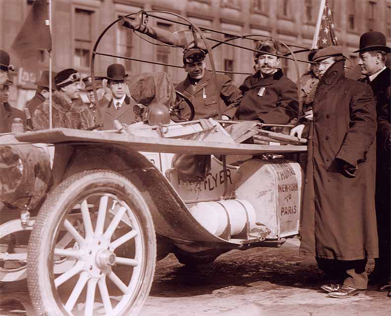 ![]() This is the way it looked on Feb. 12, 19O8 when six automobiles lined up for the New York to Paris race. The cars included a DeDion, a Motobloc, |